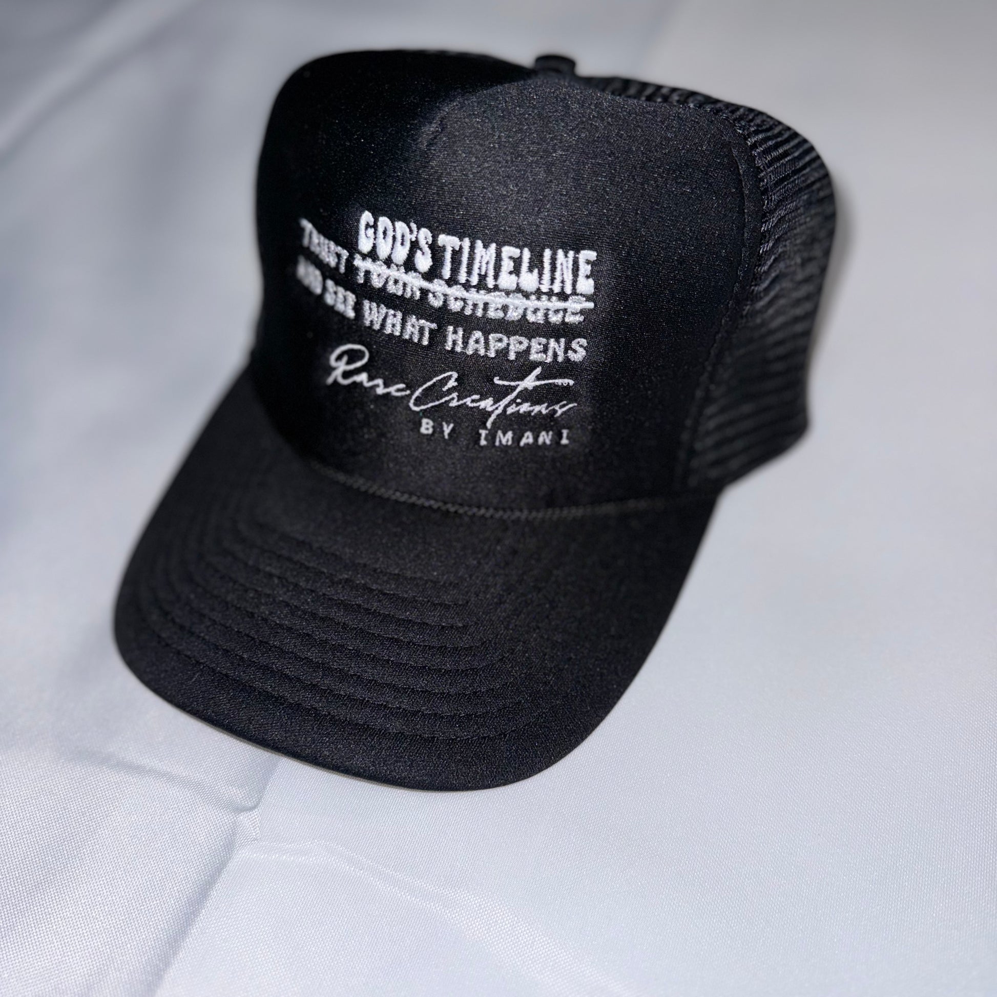“TRUST GOD’S TIMELINE” METALLIC SILVER TRUCKER HAT